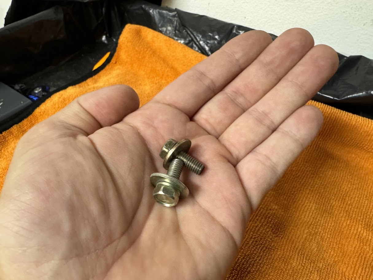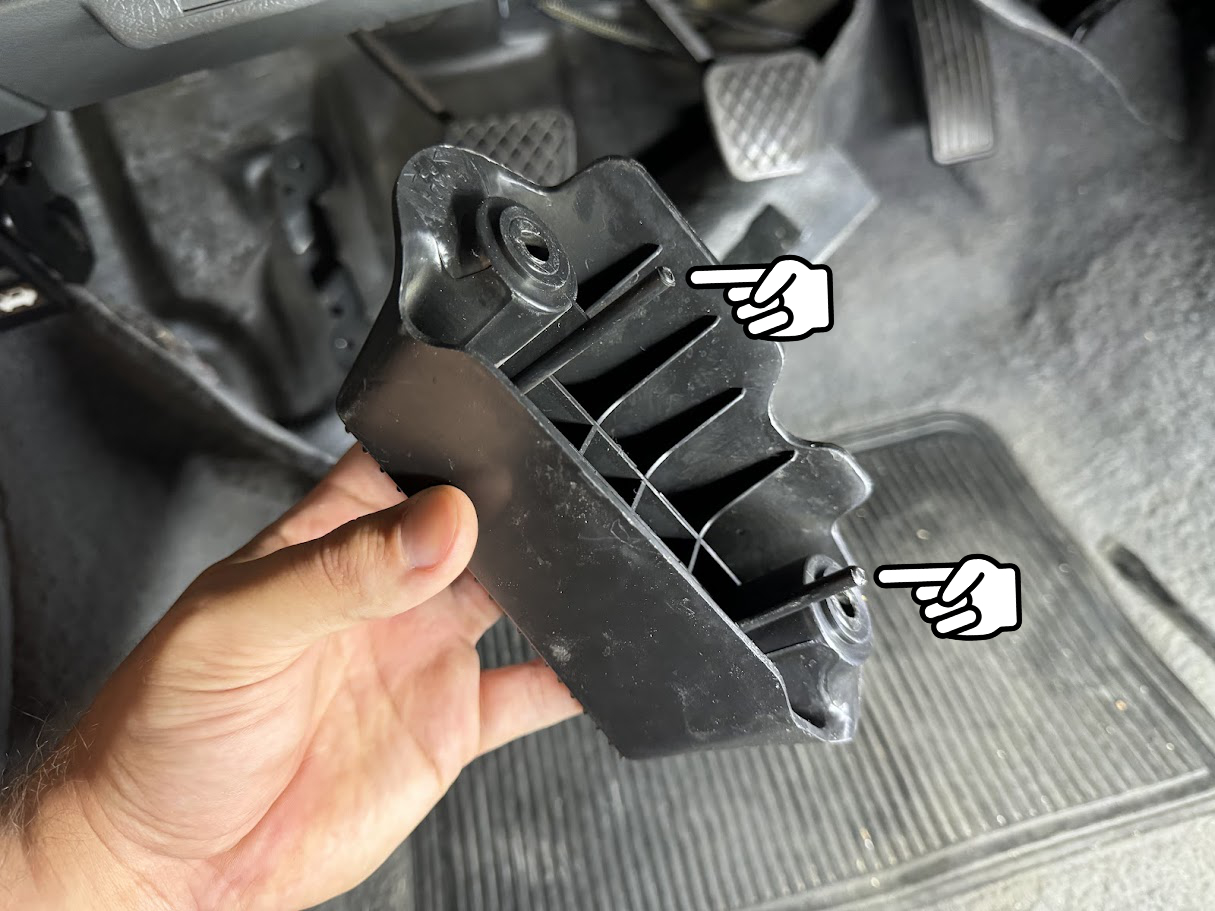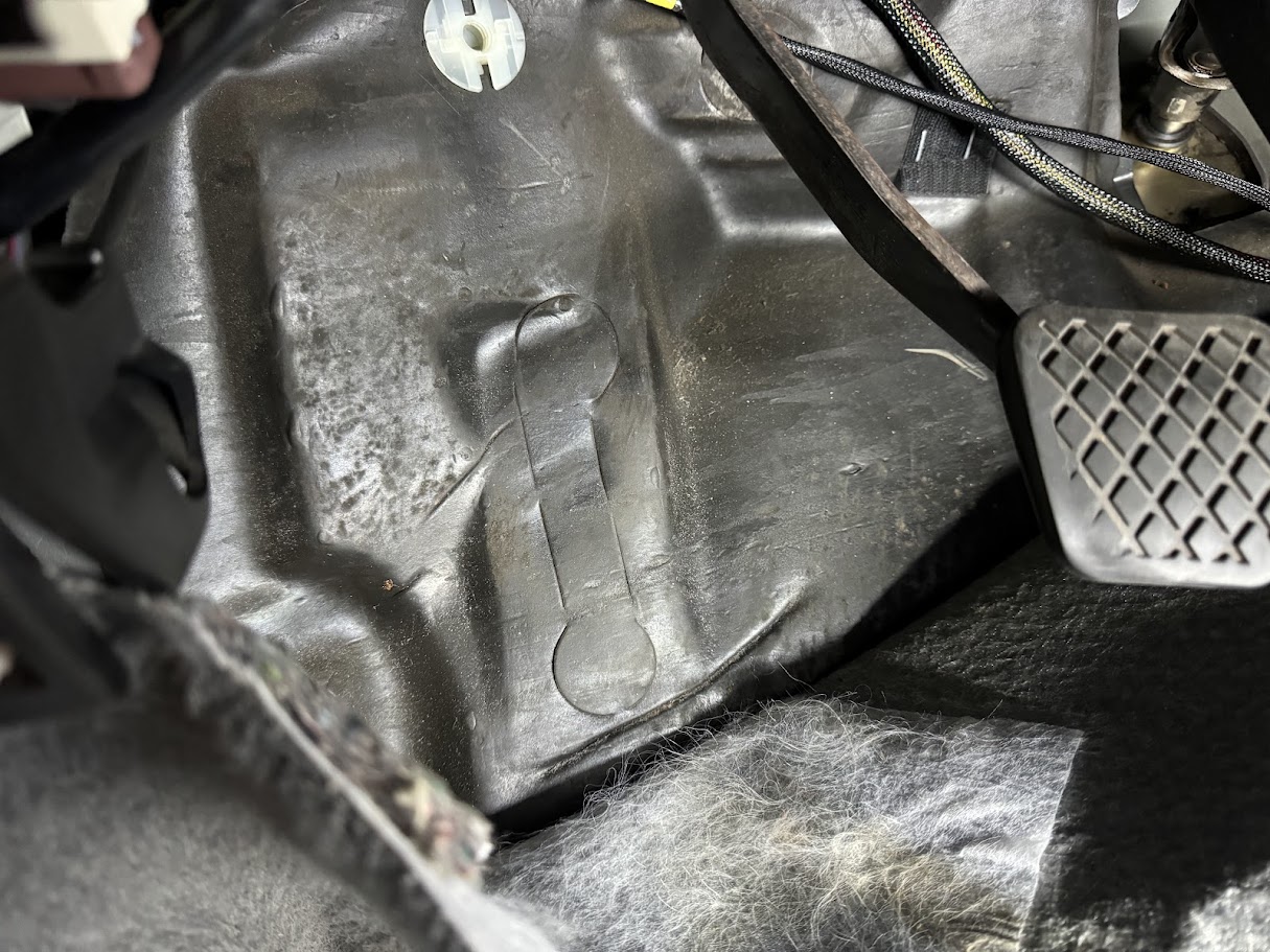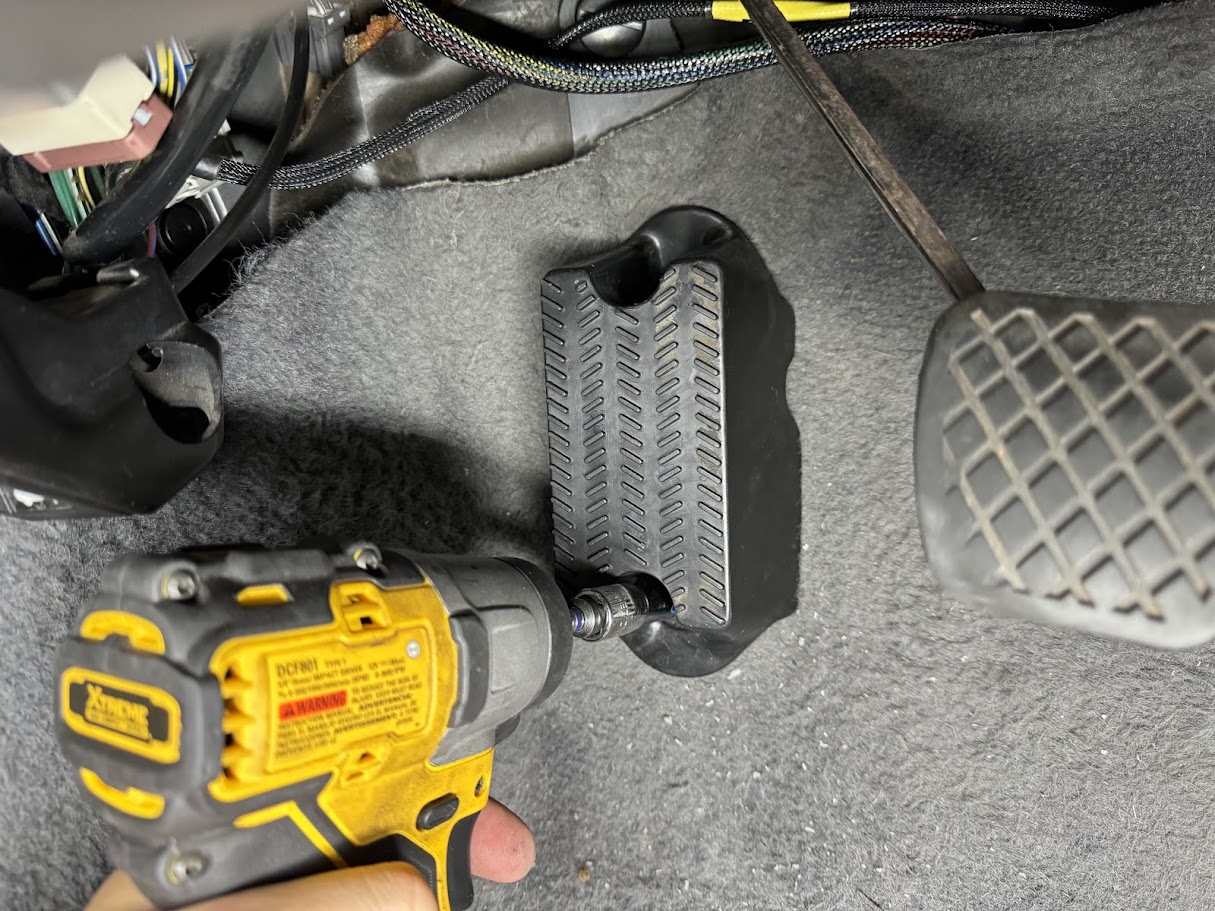 I used a couple of random 10mm bolts with washers I had in my stash, but I’ve linked the official part number at the top of the guide along with the pedal if you don’t have them. Push the pedal onto the carpet by GENTLEY lining up the pins first, once you feel those go in you can push it down so its flush with the carpet, I found it easier to start with the bottom pin and bolt, and then do the top. Then simply tighten down both bolts and your finished!